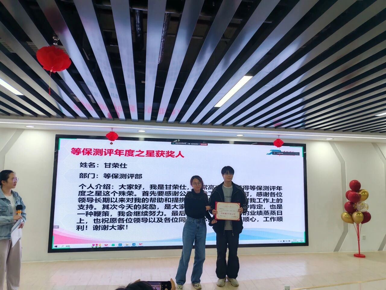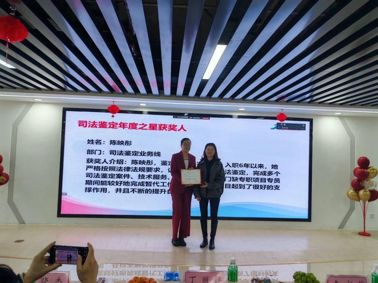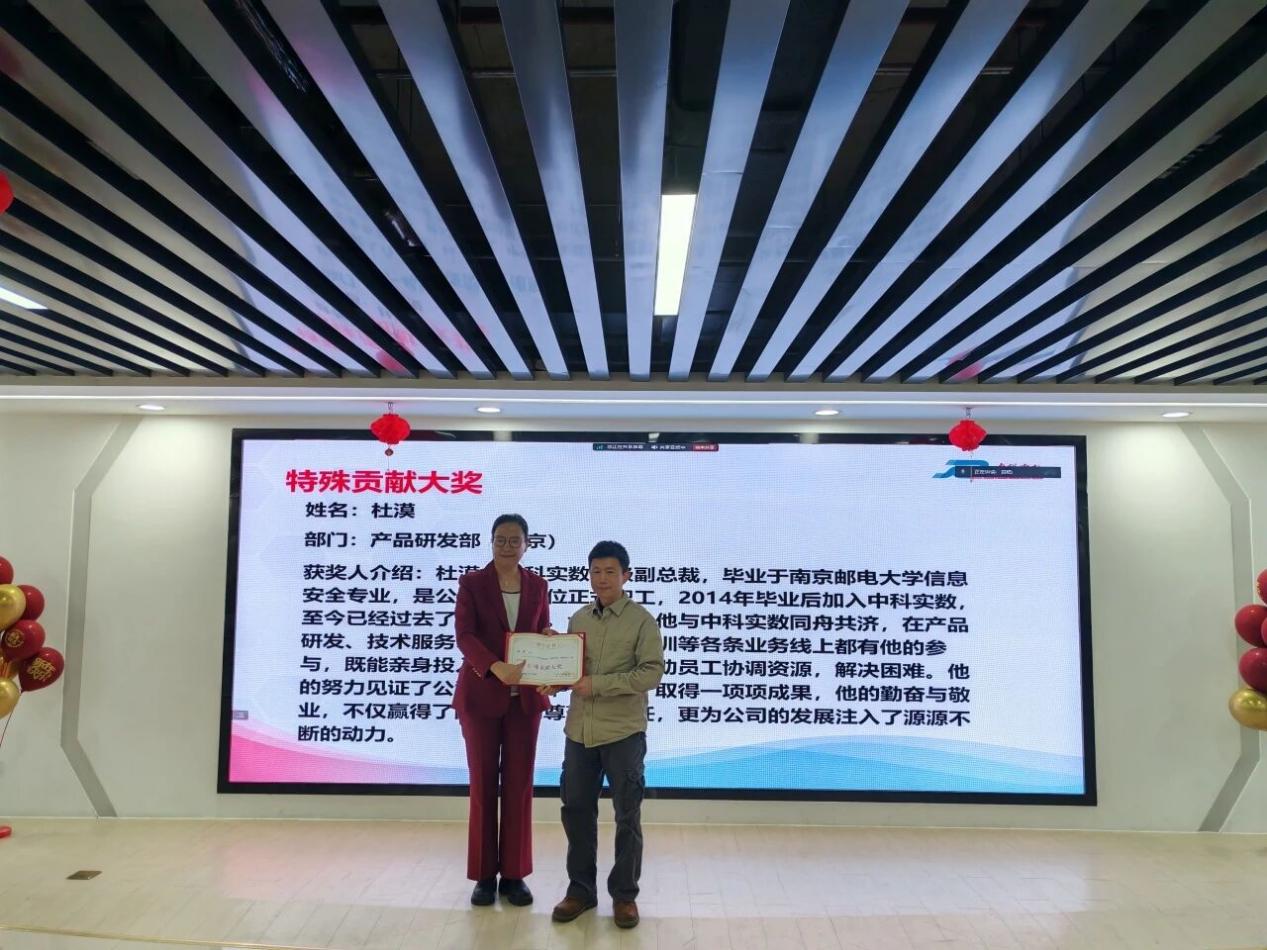 在颁奖环节,“等保测评年度之星”荣誉称号授予了甘荣仕先生,“市场销售年度之星”荣誉称号授予了郑晓杰先生,“产品研发年度之星”荣誉称号授予了黄昭颖先生,“司法鉴定年度之星”荣誉称号授予了陈映彤女士,“年度优秀团队”荣誉称号授予了严谨细致的等保测评团队,“特殊贡献大奖”则颁发给了勤奋敬业的中科实数高级副总裁杜漠先生,以表彰他们对公司的辛勤付出和卓越贡献!