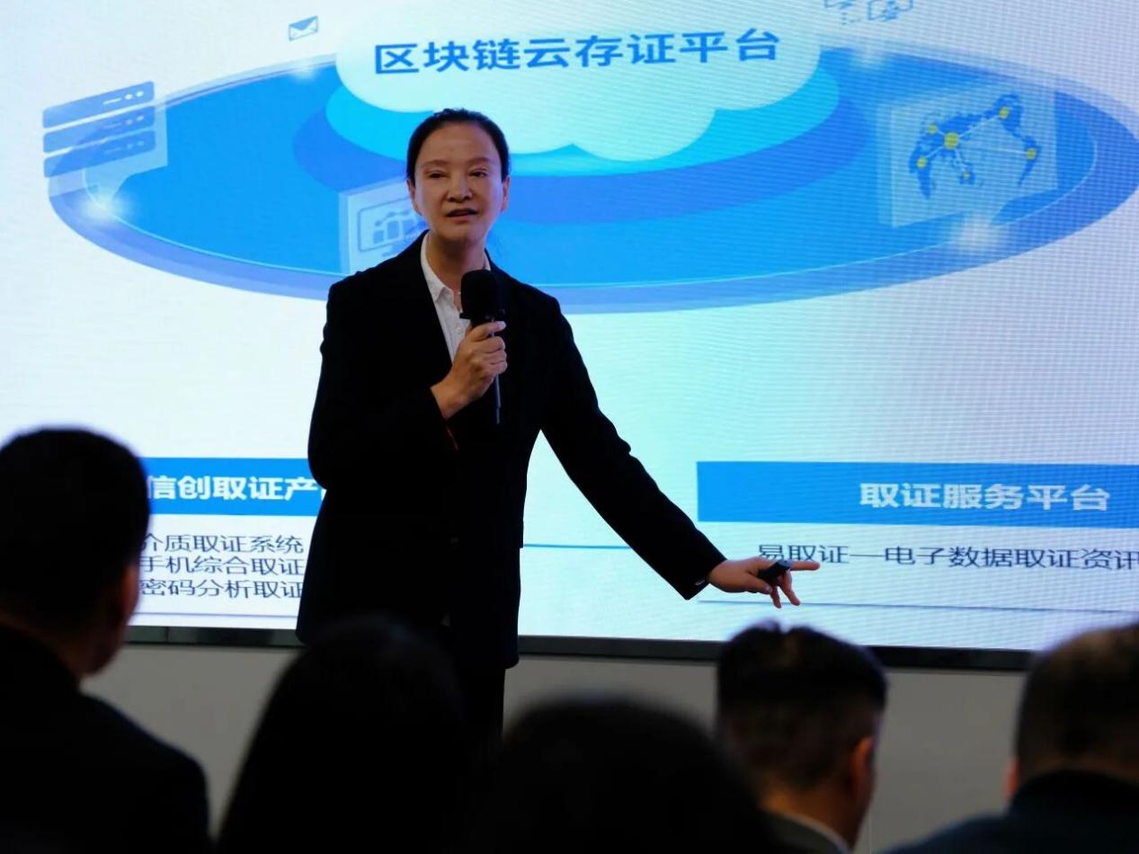 中国科学院软件研究所研究员、中科实数董事长丁丽萍老师参与了南沙分会场的宣讲。丁老师亲自登台向与会人员介绍了中科实数的团队和业务概况,特别重点介绍了中科实数多年深耕的法律科技产品和服务业务。她通过实际应用场景,形象生动地介绍了电子数据取证的九大类20多款产品在执法办案和法律服务中发挥的重要作用。随后,丁老师介绍了中科实数司法鉴定团队完成的多个部督专案和有重要影响力的案件的司法鉴定和在中国科学院软件研究所带领下申请的人工智能治理方面的国家项目。指出声像资料(含电子数据)司法鉴定作为一项基本属性是“科学性”的工作必将会在智能化加法治化时代发挥越来越重要的作用。