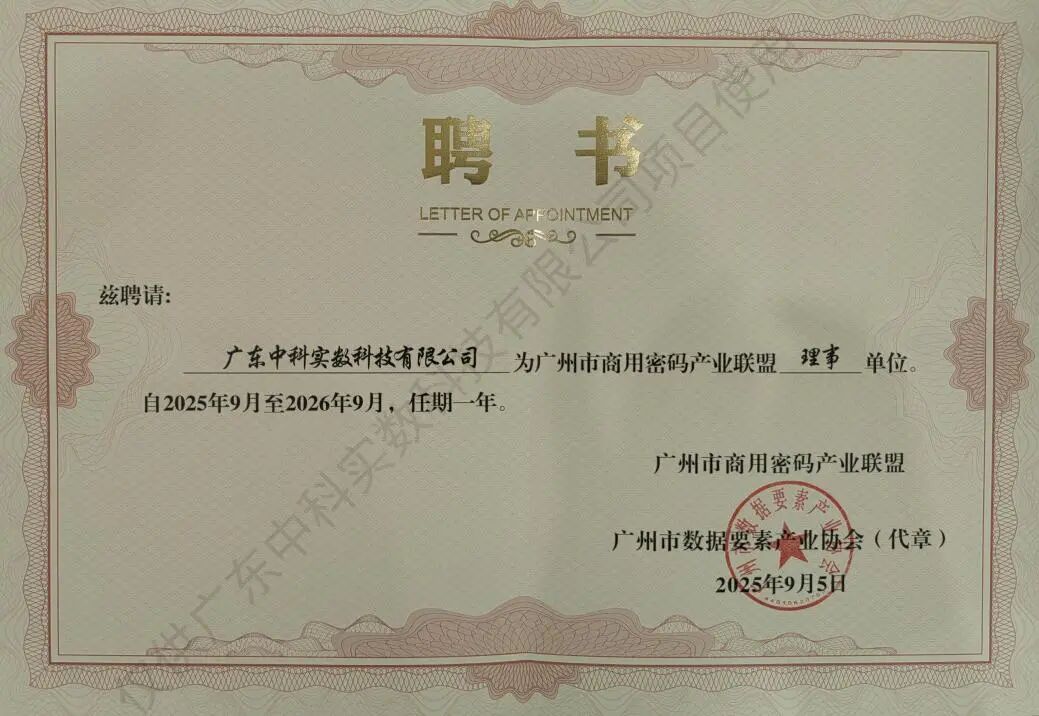 喜报|中科实数被广州市商用密码产业联盟聘请为理事单位