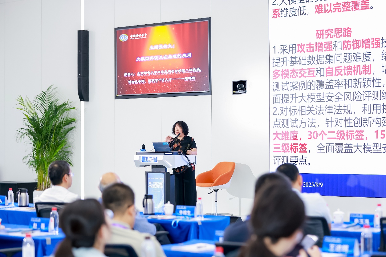 北京邮电大学网络空间安全学院二级教授,清华大学博士后,国家百千万人才。周琳娜教授在本届研讨会上做了主题为——大模型评测及在垂域的应用的专题报告。周教授指出:随着大模型的迅猛兴起,如何安全地监管和应用大模型是世界各国面临的难点问题。该报告针对我国现有的大模型安全监管相关政策和标准进行了解读,对大模型的安全评估和性能评测进行了研究,并对垂直领域大模型在深度伪造合成及检测和金融AI投研监管方面的应用进行了研究和探讨。