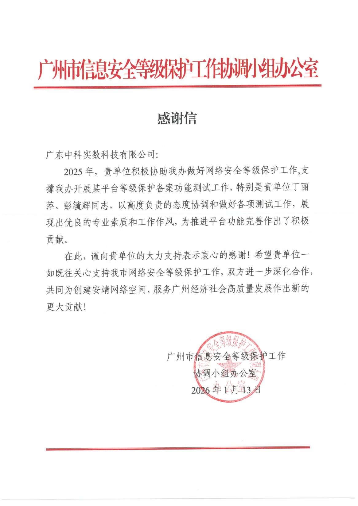 近日,广州市信息安全等级保护工作协调小组办公室给广东中科实数科技有限公司(简称:中科实数)发来一封感谢信,感谢中科实数对网络安全等级保护工作的大力支持,感谢信全文如下: