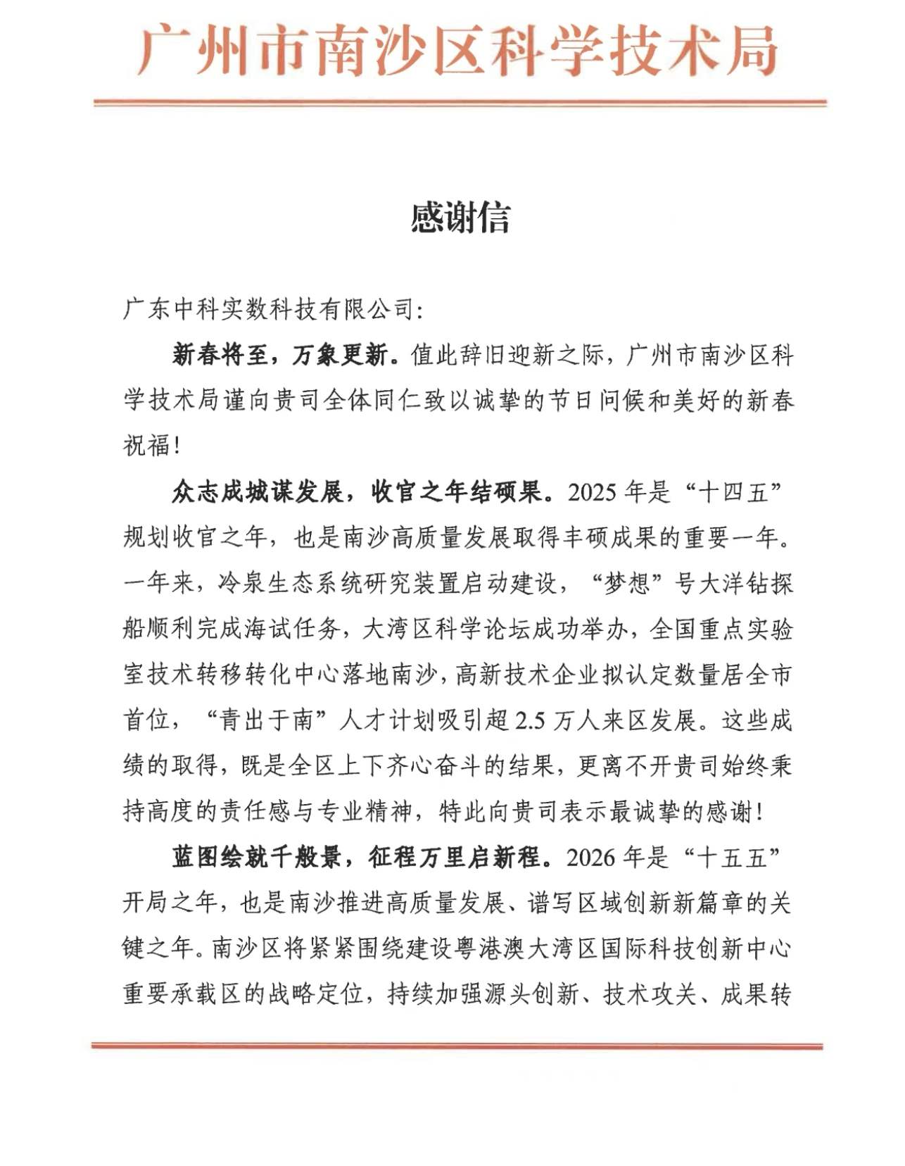 近日,中科实数收到了一份特别的新春礼物——一封来自广州市南沙区科学技术局的感谢信,感谢中科实数对南沙科技创新事业发展的鼎力支持与协作,感谢信全文如下: