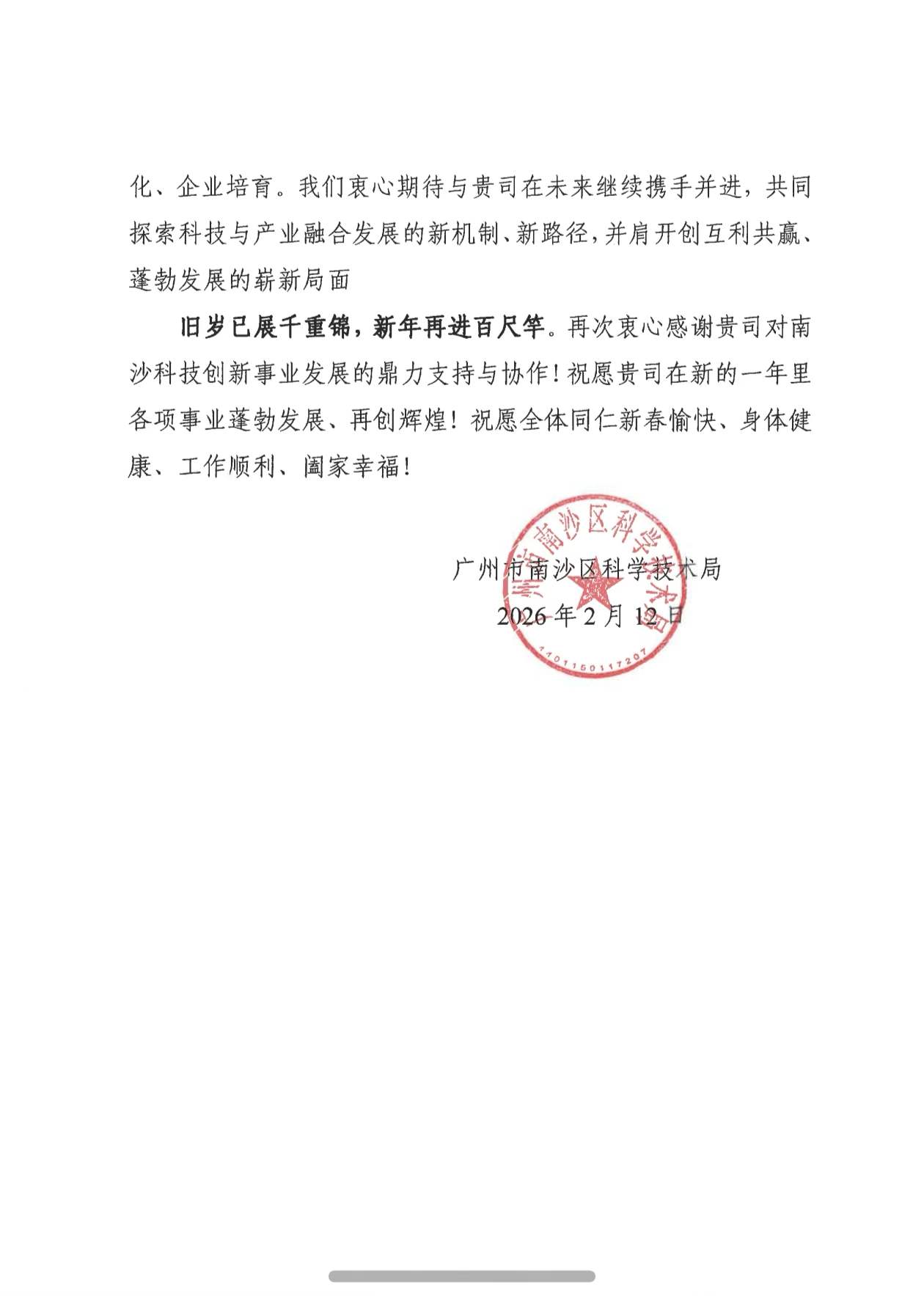 一封来自广州市南沙区科学技术局的感谢信